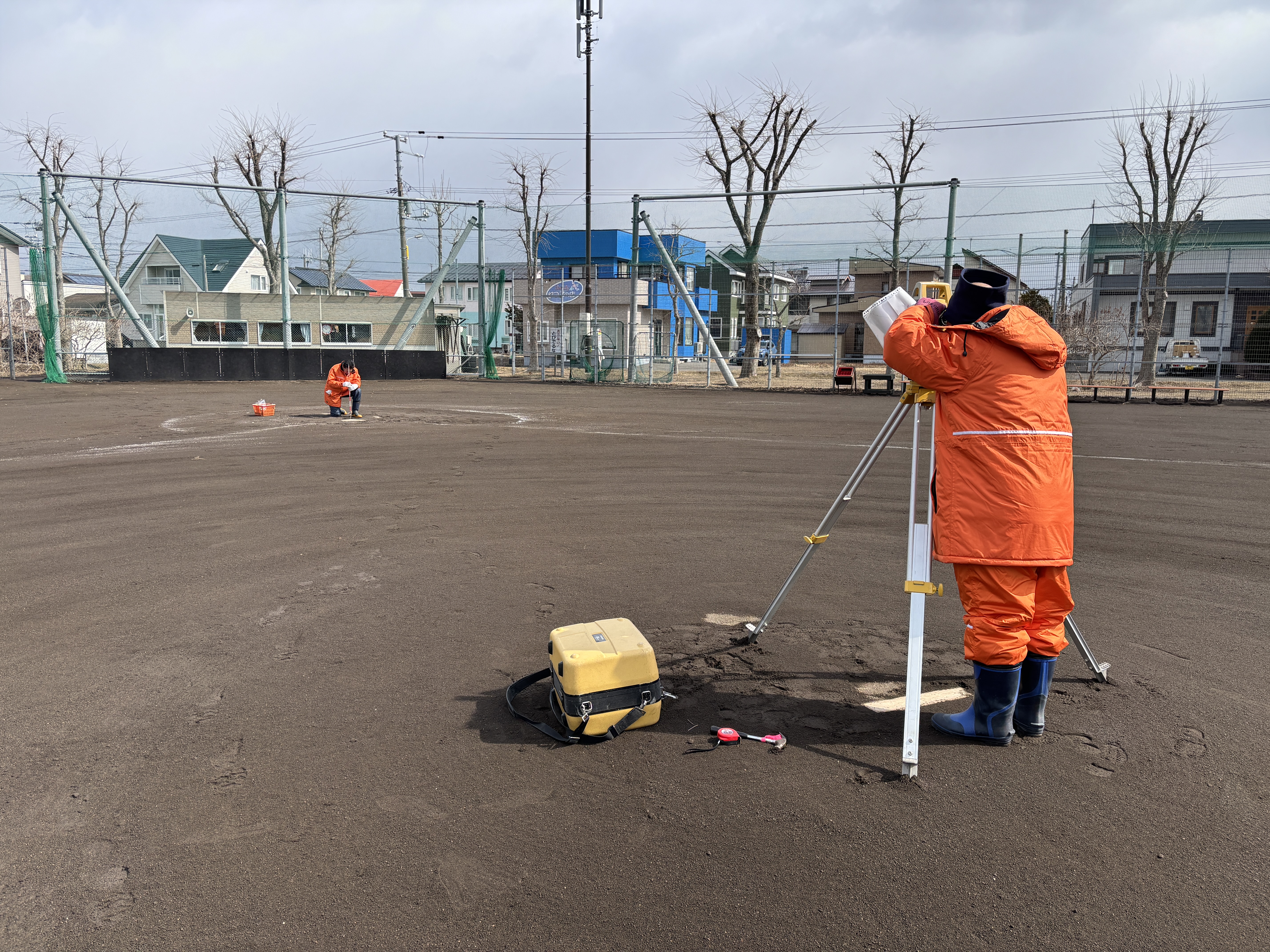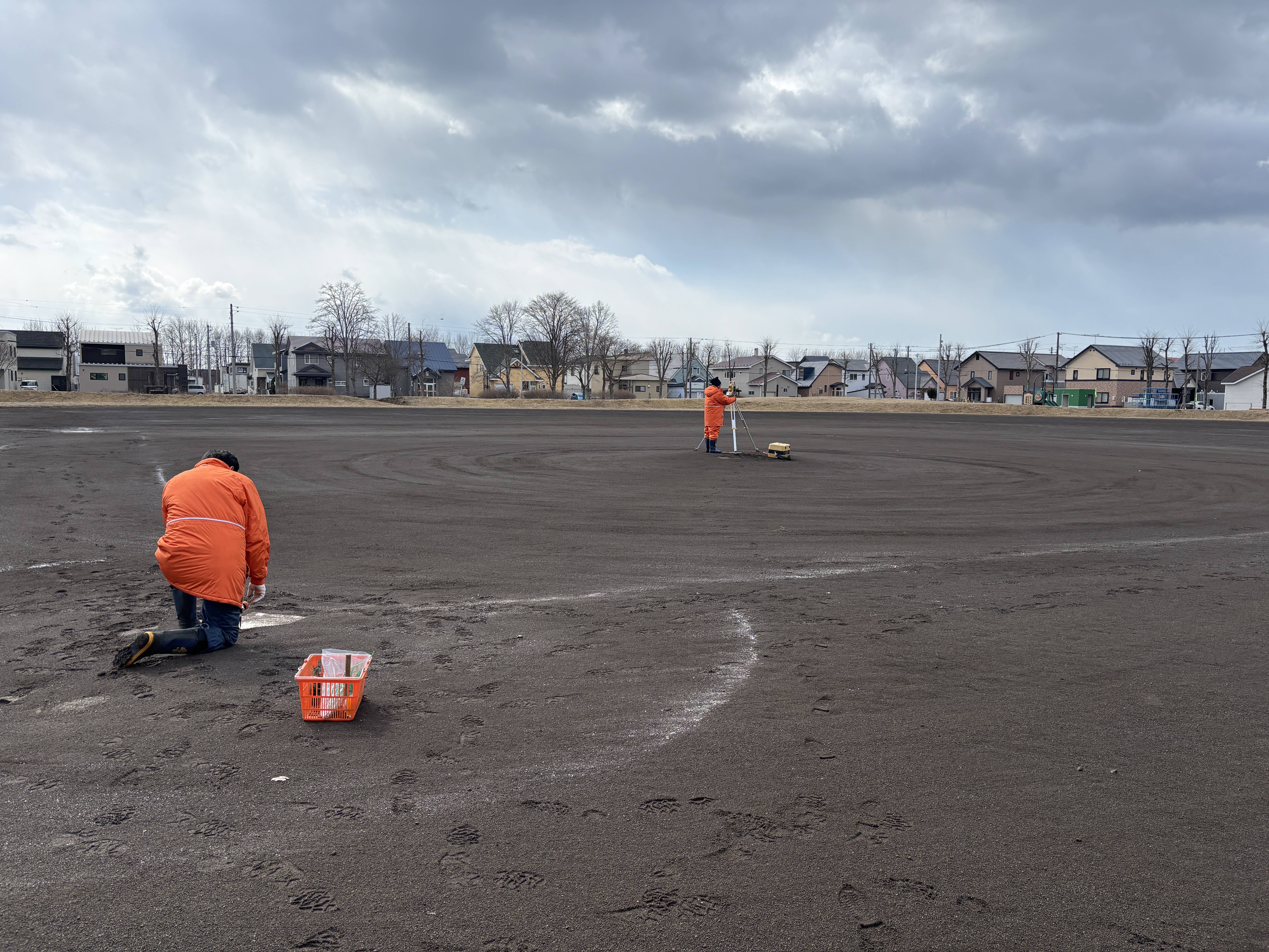先日、苫小牧市にある少年野球チーム 泉野イーグルスがホームグランドにしている豊陵公園グランドのベース等の位置出しを行いました。これは父兄が子供たちの試合のたびに白線を引くための印になります。